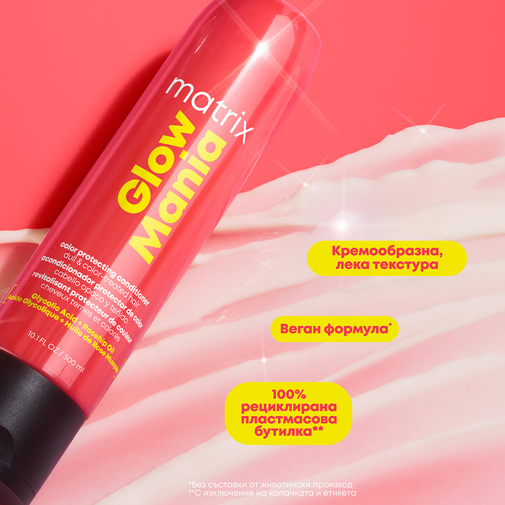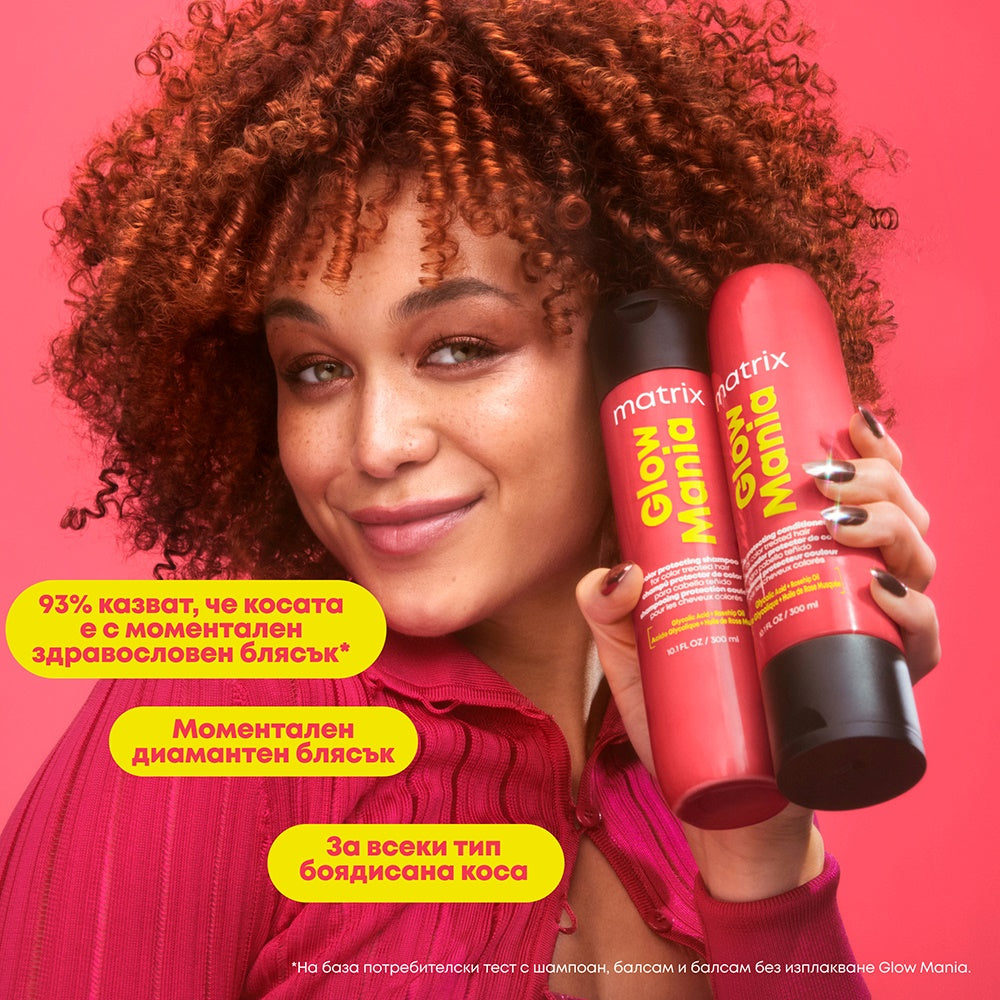 2. Балсам за защита на цвета: Веднага след измиване с шампоан Glow Mania, нанесете по дължините и краищата, като избягвате очите, скалпа и косата. Оставете да действа за до 1 минута, след което изплакнете.