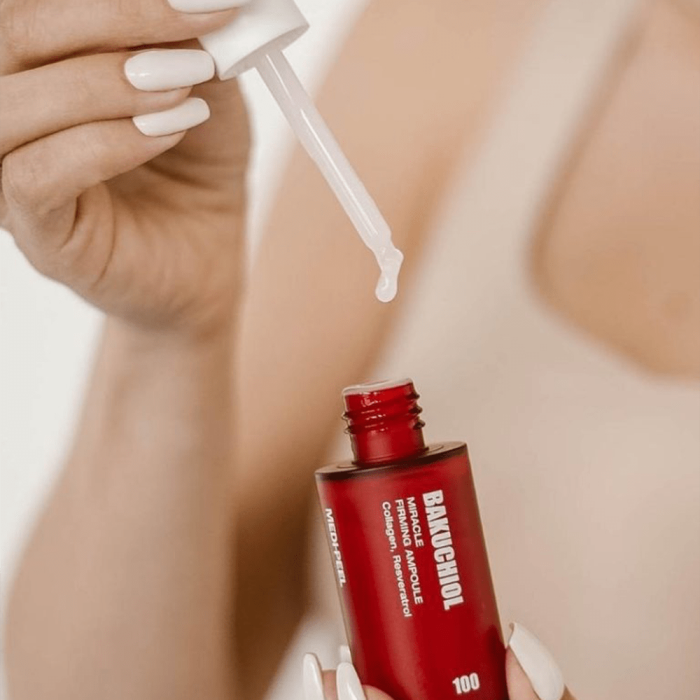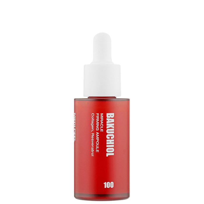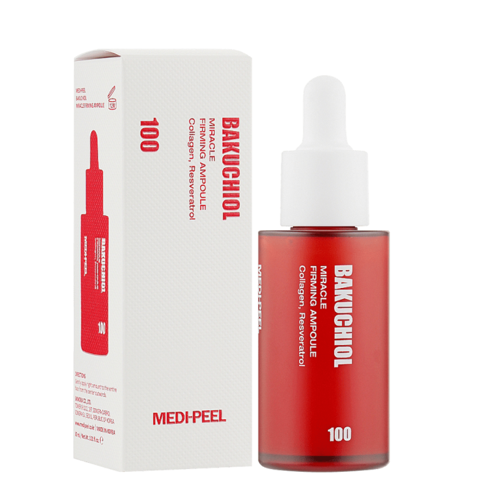 Medi-Peel Bakuchiol Lift Firming Ampoule е ампула за лице с бакучиол и пептиден комплекс, която подобрява еластичността и текстурата, и заздравява кожната бариера. Бакучиолът е естествен заместител на ретинола, който помага против стареене. Намалява появата на фините линии и бръчки, възстановява еластичността, подобрява текстурата и изравнява тена. Укрепва колагена на кожата, благодарение на комбинация от патентовани съставки и пептиди. Комплексът от пептиди има подмладяващ ефект, изглажда бръчките и запазва младежкия вид на кожата. Подобрява съдържанието на влага и текстурата на кожата, благодарение на хиалуроновата киселина в състава. Тя прониква в дълбоките слоеве на кожата и действа ефективно срещу дехидратацията на кожата. Съдържа азиатска центела, която интензивно регенерира, успокоява и укрепва кожната бариера, като възстановява хидратацията.