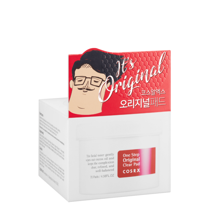 Cosrx One Step Original Clear Pad са ексфолиращи и почистващи тампони за лице с BHA и натурални съставки. Почистват кожата, регулират производството на себум, хидратират, намаляват видимостта на порите и помагат за успокояване на възпаленията и раздразненията. Тампоните имат релефна страна, която ексфолира мъртвите кожни клетки, както и гладка страна, която изглажда и хидратира.