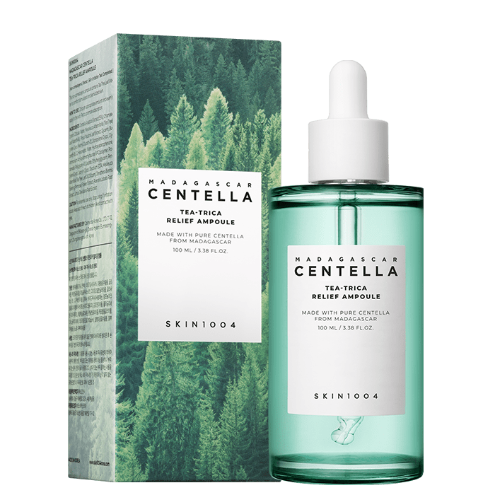 Серумът SKIN1004 Madagascar Centella Tea-Trica Relief Ampoule е насочен към кожа, склонна към акне и черни точки. Има некомедоненна формула, която третира възпаленията и раздразненията, и спомага за тяхното облекчение. Съдържа екстракт от азиатска центела и комплекс от кипарисова вода, кралски бор и чаено дърво. Азиатската центела облекчава раздразненията, хидратира, регулира баланса на влагата и маслата в кожата. Намалява излишната секреция на себум и появата на разширени пори, и подобрява текстурата на кожата.