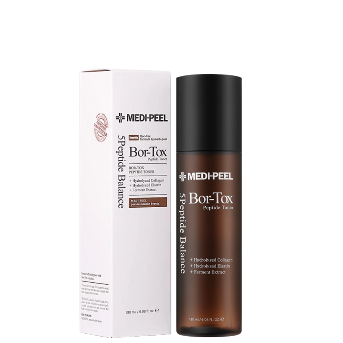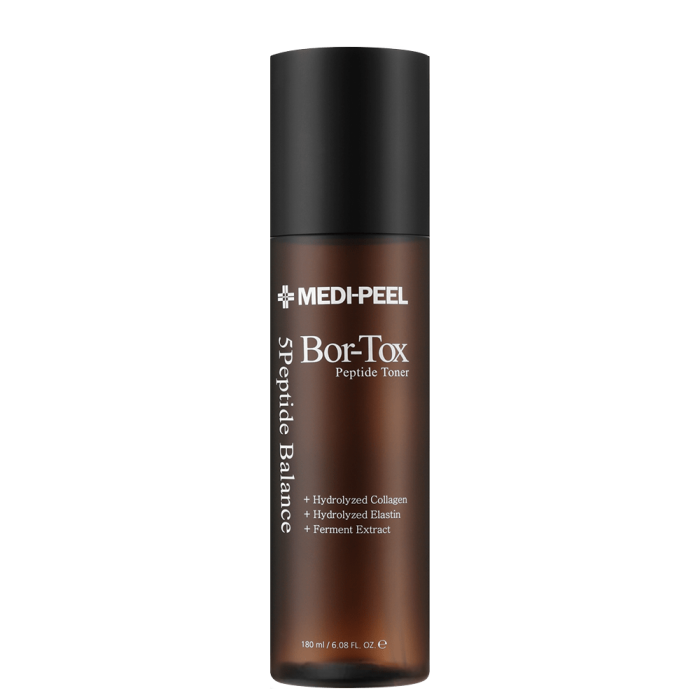 Medi-Peel Peptide Bor-Tox Toner е тонер за лице с 5 вида пептиди, 7 вида ферментирали съставки, Volufiline, пантенол и пробиотик, който има ботокс ефект, намалява фините бръчки и линии, подобрява еластичността и забавя процесите на стареене. Комплексът от 5 вида пептиди има подмладяващ ефект, спомага за изглаждане на бръчките и запазване на младостта на кожата. Бори се с мимическите бръчки, причинени от движение на мускулите на лицето. Подобрява еластинчността на кожата, така че кожата да изглежда и да се чувства по-гладка и стегната. Стимулира производството на колаген и еластин.