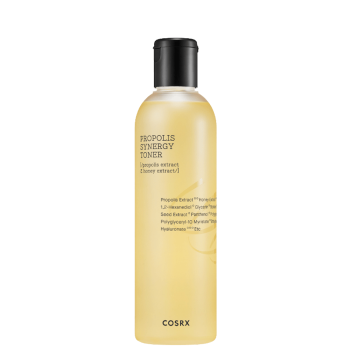 COSRX Full Fit Propolis Synergy Toner е хидратиращ тонер за лице със 72,6% екстракт от прополис от черна пчела. Балансира производството на себум, ускорява регенерацията на кожните клетки, изглажда и омекотява кожата. Намалява зачервяванията и раздразненията, като едновременно с това подобрява цялостния вид на кожата. Има анти-ейдж действие и защитава кожата, като я подхранва и предотвратява появата на акне.