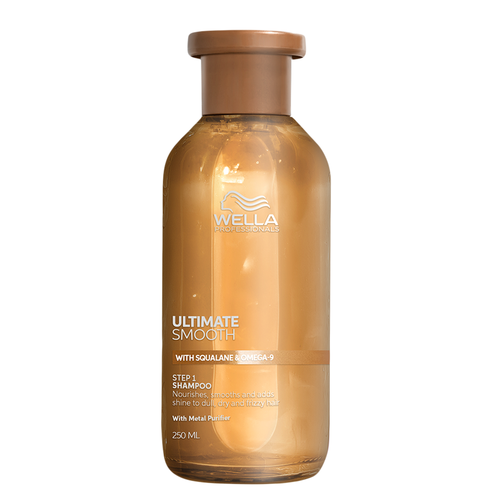 Изглаждащ шампоан за непокорна и суха коса Wella Professionals Ultimate Smooth Shampoo подхранва в дълбочина и нежно почиства скалпа. Съдържа технология за неутрализиране на металите във водата, сквалан и Омега-9. Създава защитен филм около косъма. Подходящ за всеки тип коса, включително боядисана.