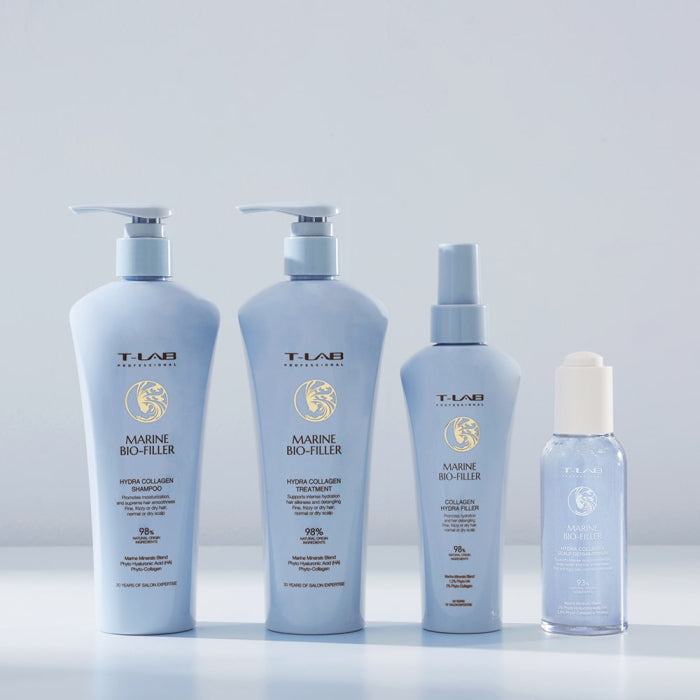 Морски био-филър шампоан с колаген T-LAB Marine Bio-Filler Hydra Collagen Shampoo нежно почиства и се грижи за възстановяването на увредената коса. Особено подходящ за фина, къдрава или суха коса и нормален или сух скалп. Подсилената му хидратираща формула спомага за поддържането на оптималните нива на хидратация в скалпа и осигурява изключителна гладкост на косата. Комплексът „Океански минерали“ включва натрий, калий, калций и магнезий, които подпомагат подхранването и укрепването на косата. Фитохиалуроновата киселина подобрява еластичността и хидратацията, а фитоколагенът спомага за интензивното задържане на влага в косъма. Съдържа 98% натурални съставки.