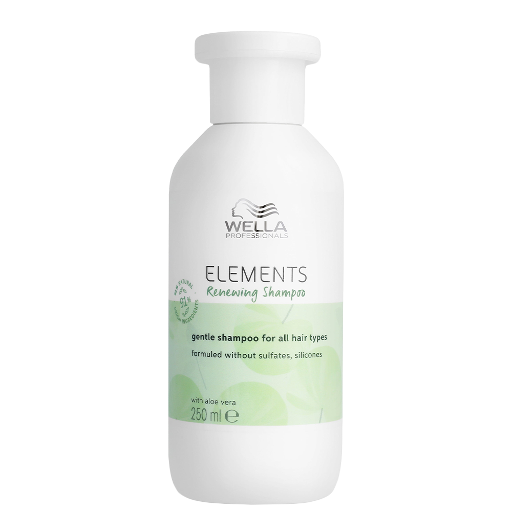 Обновяващият шампоан Wella Professionals Elements Renewing Shampoo нежно почиства и обновява кожата на скалпа и косата, без да нарушава естествените им нива на хидратация. Създаден с високоефективна формула с 91% съставки от естествен произход Формулиран с алое вера, маслинова есенция и витамин Е, които хидратират косата, ревитализират я, обновяват кожата на скалпа и помагат за поддържането на хидро-липидния баланс.