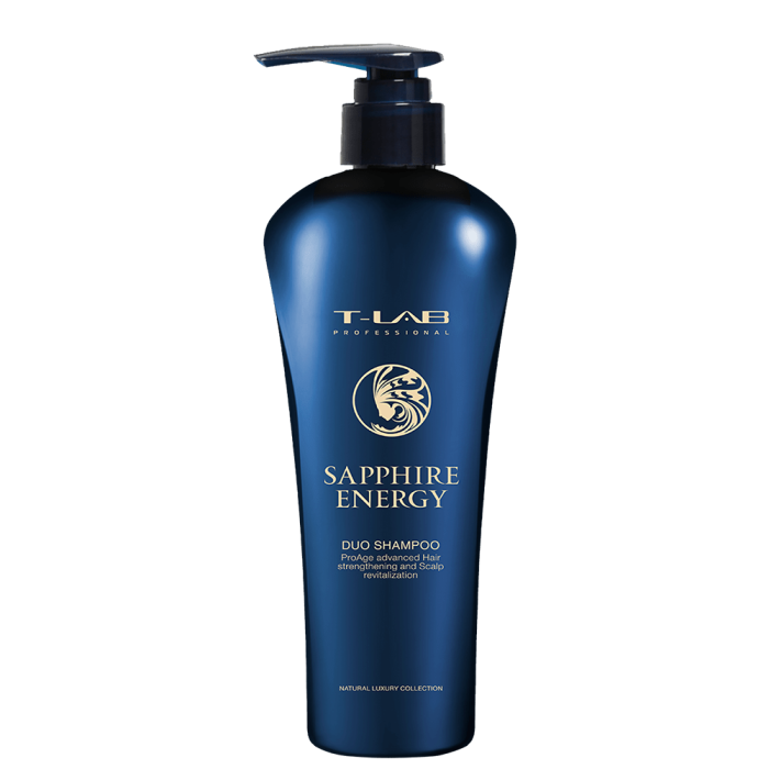 Ревитализиращ шампоан анти-ейдж T-LAB Sapphire Energy Duo Shampoo е насочен към поддържането и подобряването на цялостното състояние на косата с напредването на възрастта. Отговаря на всички специфични нужди на зрялата коса, които се появяват с възрастта, като загуба на обем и плътност, побеляване, намалена еластичност и сухота. Съдържа комбинация от растителни екстракти и сертифицирани органични съставки, които възвръщат виталността и огледалния блясък на косата.
