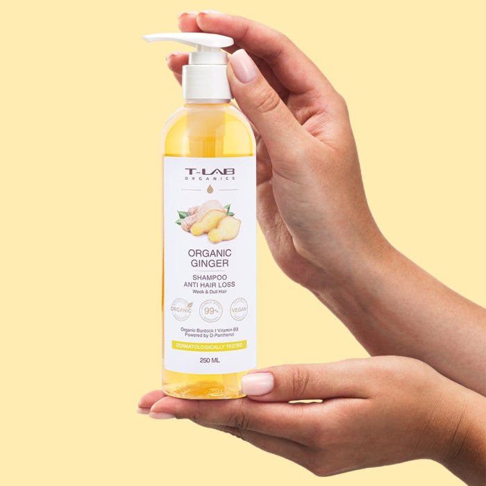 Шампоан против косопад с органичен джинджифил T-LAB Organic Ginger Anti Hair Loss Shampoo деликатно почиства скалпа, премахвайки натрупаните замърсявания, остатъци от стилизиращи продукти и оставя усещане за свежест и чистота. Ефективната формула, съдържаща натурални съставки спомага за предотвратяване на косопада и подобрява микроциркулацията на скалпа. Изключително подходящ за слаба и изтощена коса, като възстановява нейната жизненост и блясък. Комбинацията от джинджифил и масло от репей ефективно намалява пърхота, успокоява раздразнения скалп и поддържа здравословен баланс на кожата. Резултатът е видимо по-здрава, плътна и сияйна коса. Съдържа 99% натурални съставки.