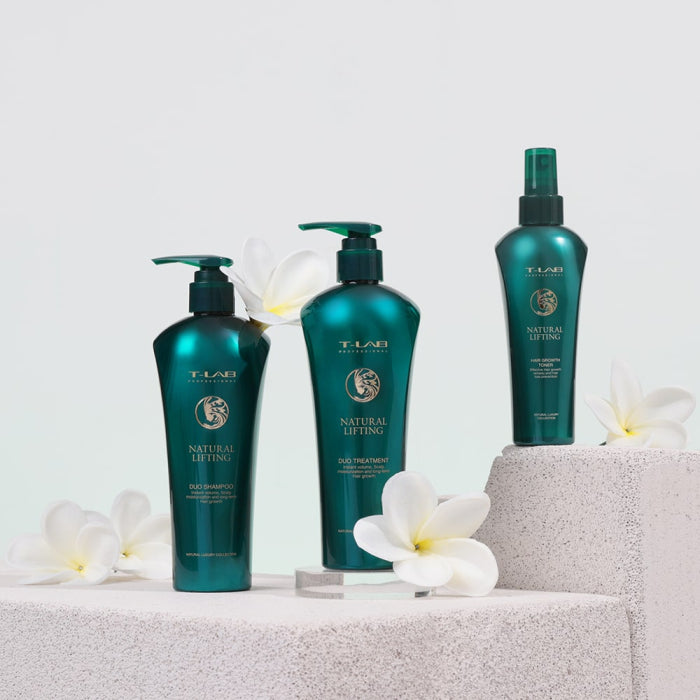 Шампоан за незабавен обем T-LAB Natural Lifting Duo Shampoo нежно почиства скалпа от всички замърсявания и остатъчни стилизиращи продукти, повдигайки косата от корена. Подходящ е за всеки тип коса, особено тънка и изтъняваща коса, която се нуждае от повече обем и плътност. Формулата със сертифицирани органични съставки осигурява обем хидратира скалпа в дълбочина. Подпомага естествения растеж, като съживява космените фоликули. Шампоанът уплътнява всеки косъм, позволявайки на косата да расте по-здрава, силна и подхранена. Резултатът е хидратиран скалп и коса с подобрена плътност и дълготраен обем. Съдържа 98,4% натурални съставки.