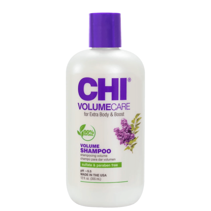 Шампоанът за обем CHI VolumeCare Volumе Shampoo без сулфати е специално създаден за нежно почистване и придаване на максимален обем на тънката и фина коса. Формулата с алое вера и люляк повдига косата от корена, като придава допълнителен обем и плътност. Притежава уплътняващ ефект, който действа като мощен бустер за обем и придава усещане за двойно повече коса. Осигурява балансирана хидратация и прави косата гладка, мека и приятна на допир, без да я утежнява. Регенерира и укрепва космените фоликули, подобрява еластичността и намалява начупването на косата. Включените в състава на шампоана копринени протеини осигуряват увеличаване на плътността и еластичността на всеки косъм. Косата е видимо по-силна и здрава с разкошен блясък.