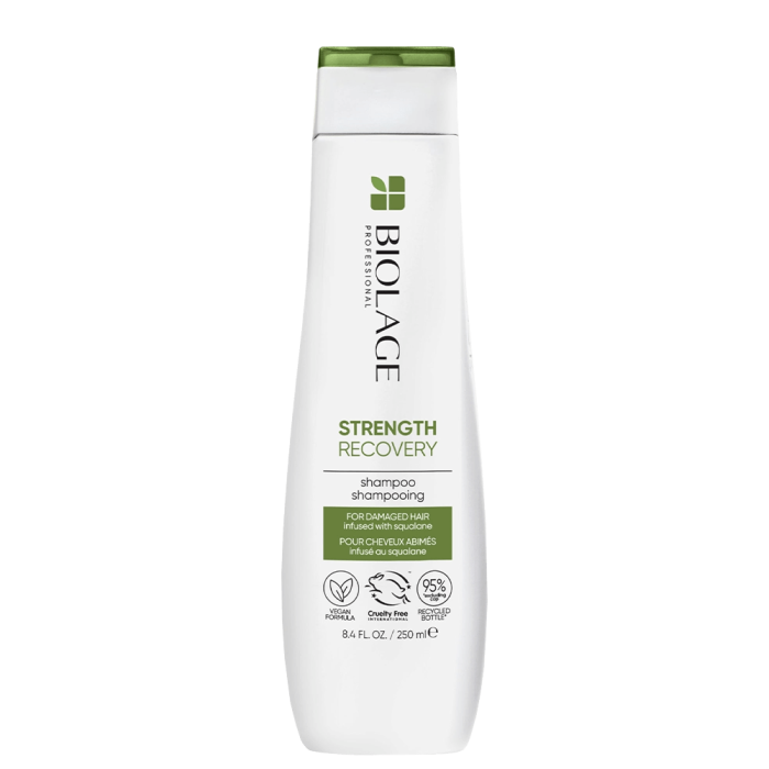 Шампоан за увредена коса Biolage Strength Recovery Shampoo, обогатен със сквалан с естествен произход с нежна формула, която почиства и действа за предпазване на накъсването на косата по дължините. Богатата пяна помага за бързото премахване на натрупванията от себум и замърсявания по скалпа и косъма. Придава мекота и прави косата гладка, без да утежнява. Скваланът имитира естествените липиди на косата и когато се използва в активни нива, помага за възстановяване и защита от бъдещо увреждане, като същевременно увеличава мекотата и блясъка.