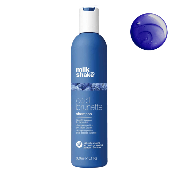 Cold brunette shampoo е шампоан, който неутрализира медните оттенъци на кестенява коса. Почиства нежно и деликатно. Съдържа специален син пигмент, разработен за премахване на нежеланите топли тонове от естествена или боядисана кафява, светлокафява или тъмно руса коса. Удължава ефекта на студените тонизиращи тонове. Формулиран е с масло от моринга, комплекс Integrity 41®, млечни протеини и протеини от киноа. Подсилва естествената красота на косата и я правя мека и блестяща. Подходящ за естествена или боядисана кестенява, светло кестенява или тъмно руса коса.