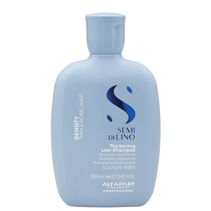 Alfaparf SEMI DI LINO Thickening Low Shampoo е нежен шампоан за уплътняване на тънка и изтъняваща коса. Почиства косата и скалпа в дълбочина и ревитализира косата.