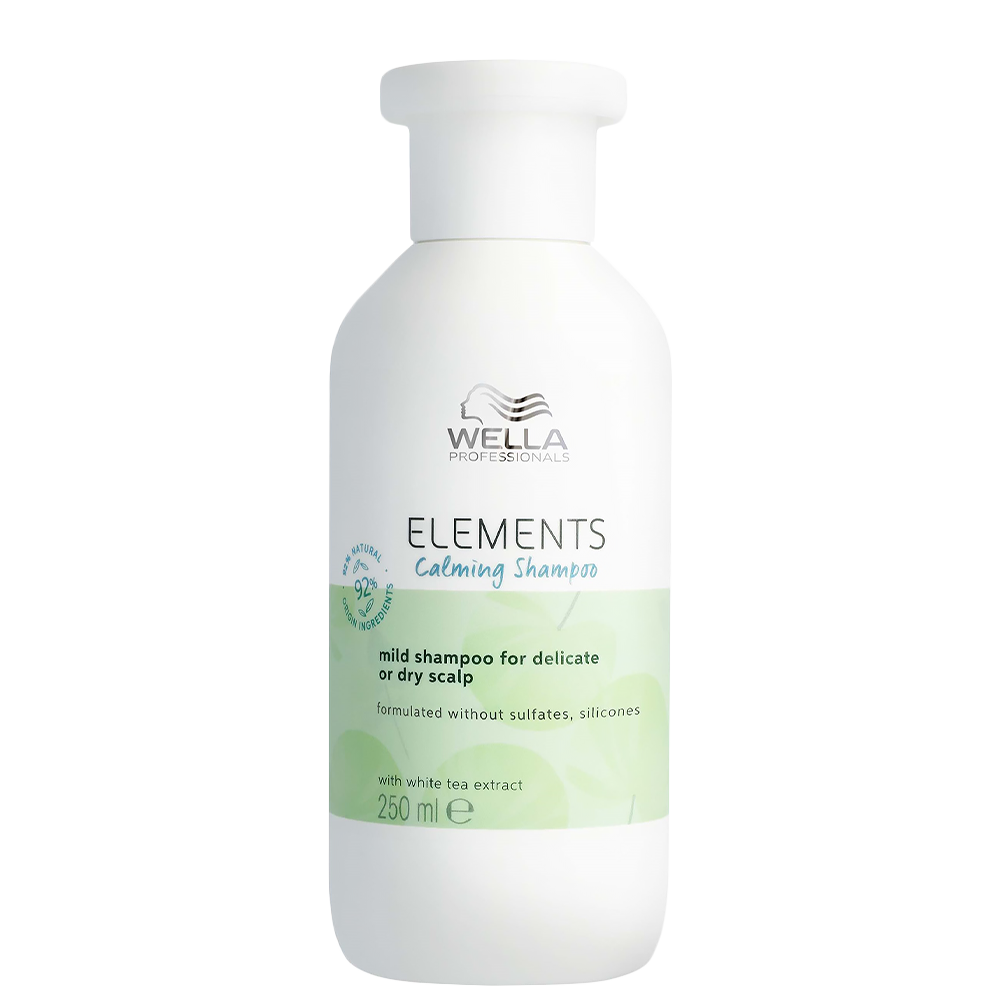 Успокояващият шампоан Wella Professionals ELEMENTS Calming Shampoo е подходящ за сух и чувствителен скалп. Действа облекчаващо и хидратиращо и възстановява комфорта на скалпа с помощта на растителен глицерин. Повърхностно активните вещества от естествен произход в състава му деликатно почистват косата и скалпа и ги балансират с усещане за повече чистота и жизненост.