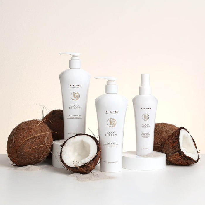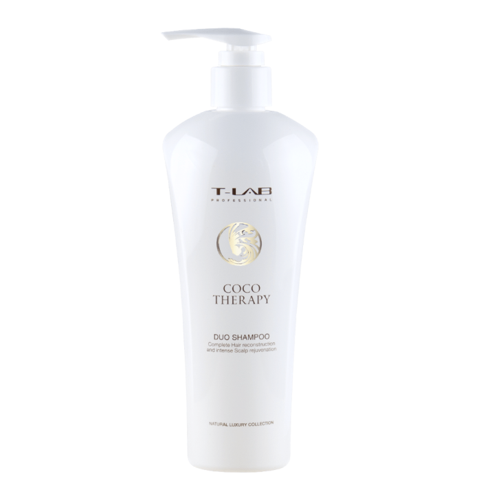 Възстановяващ шампоан с кокос T-LAB Coco Therapy Duo Shampoo нежно почиства и заздравява скалпа, като едновременно с това предотвратява накъсването и последващите увреждания на косата. Възстановява и предотвратява цъфтежа, като предпазва космените фоликули. Незабавно подобрява качеството на косата и здравето на кожата на скалпа. Съдържа 98,4% натурални съставки.