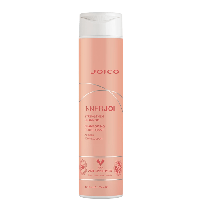 Joico Inner Joi Strengthen Shampoo е заздравяващ шампоан, който образува богата пяна и почиства деликатно замърсяванията. Възстановява увредената коса, като същевременно предотвратява бъдещите накъсвания. Укрепва тънката и слаба коса. Формулиран е с кокосово масло, абисинско масло, растителен протеин и маслинов естер. Веган формула с 90% естествено извлечени съставки. Не съдържа силикони, парабени, глутен, SLS/ SLES сулфати, фталати и минерално масло. Подходящ за изтощена коса.