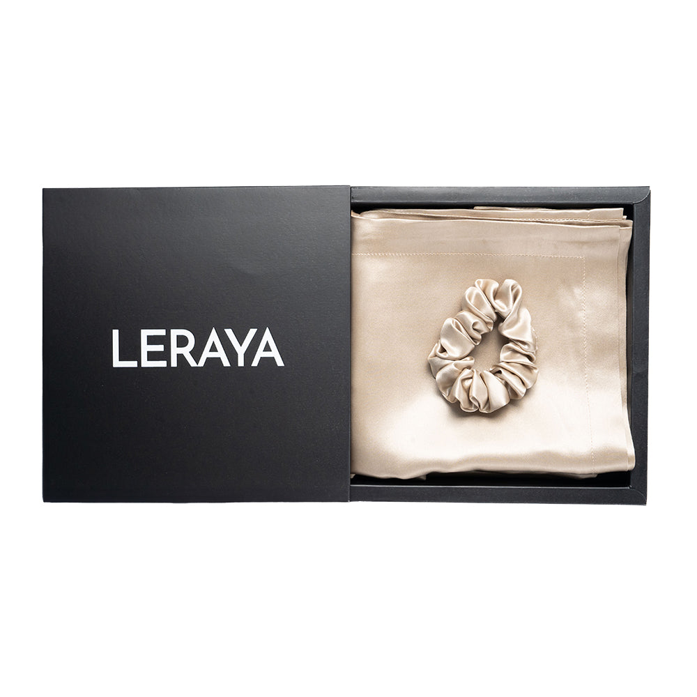 Комплект LERAYA The Ultimate Silk Pillowcase съдържа две калъфки за възглавница и елегантно копринено скрънчи, които превръщат съня в ефективен ритуал за красота. Калъфките са изработени от 100% Mulberry Silk (естествена черничева коприна). С плътност от 22 momme, материята притежава онази характерна плътна, но флуидна текстура, която гали кожата и гарантира изключителна устойчивост във времето.