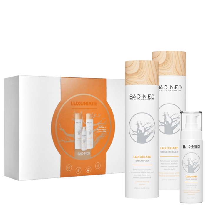 Комплектът луксозна грижа за коса BAO-MED с масло от баобаб съдържа: