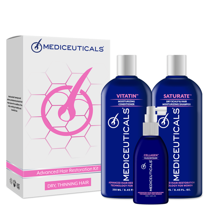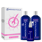 | Комплектът против косопад и за стимулиране на растежа на косата за жени със сухи скалп и коса Mediceuticals Advanced Hair Restoration Kit - Dry, Thinning Hair съдържа: Хидратиращ шампоан против косопад и за стимулиране на растежа на косата за жени със сухи скалп и коса Mediceuticals Saturate Dry Scalp & Hair Moisturizing Shampoo 250 мл Хидратиращ балсам против косопад и за стимулиране на растежа на косата за жени Mediceuticals Vitatin Moisturizing Conditioner 250 мл Биоактивен спрей против косопад и за стимулиране на фоликулите за жени Mediceuticals Cellagen Follicle Revitalizer 125 мл |