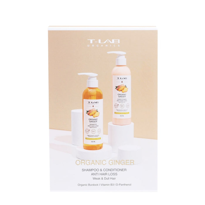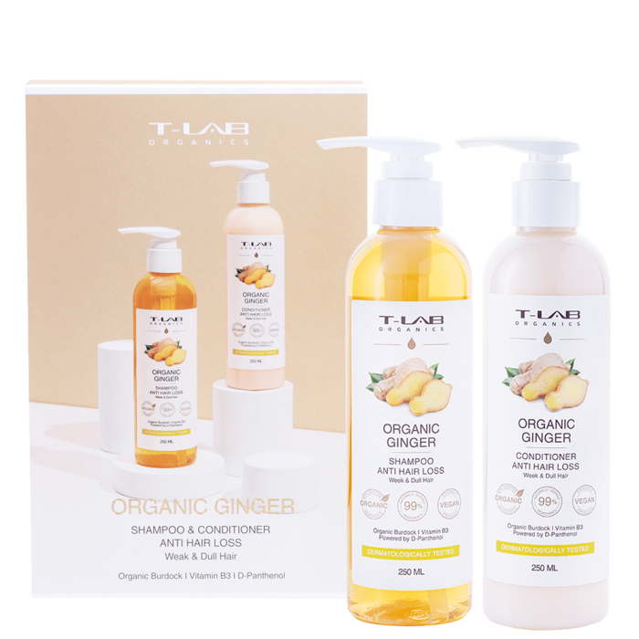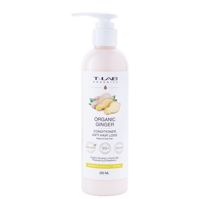 Шампоан против косопад с органичен джинджифил T-LAB Organic Ginger Anti Hair Loss Shampoo деликатно почиства скалпа, премахвайки натрупаните замърсявания, остатъци от стилизиращи продукти и оставя усещане за свежест и чистота. Ефективната формула, съдържаща натурални съставки спомага за предотвратяване на косопада и подобрява микроциркулацията на скалпа. Изключително подходящ за слаба и изтощена коса, като възстановява нейната жизненост и блясък. Комбинацията от джинджифил и масло от репей ефективно намалява пърхота, успокоява раздразнения скалп и поддържа здравословен баланс на кожата. Резултатът е видимо по-здрава, плътна и сияйна коса. Съдържа 99% натурални съставки.