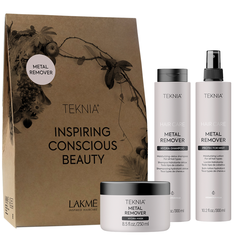 Комплект LAKME TEKNIA Metal Remover неутрализира и елиминира натрупванията на метали, минерали и замърсители от косата, съдържащи се в твърдата вода.