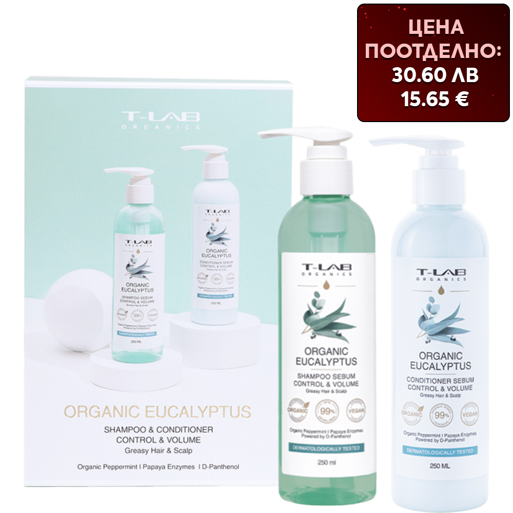 Успокояващ шампоан с евкалипт T-LAB Organic Eucalyptus Sebum Control and Volume Shampoo предлага балансирана грижа за мазна коса и скалп. Благодарение на специалната си формула, той почиства и регулира производството на себум, като същевременно придава обем и свежест на косата. Комбинацията от евкалипт и мента има охлаждащ ефект, който благоприятно облекчава раздразнения и сърбеж, като оставя чувство на свежест. Поддържа баланса на скалпа и предотвратява появата на пърхот. Съдържа 99% натурални съставки.