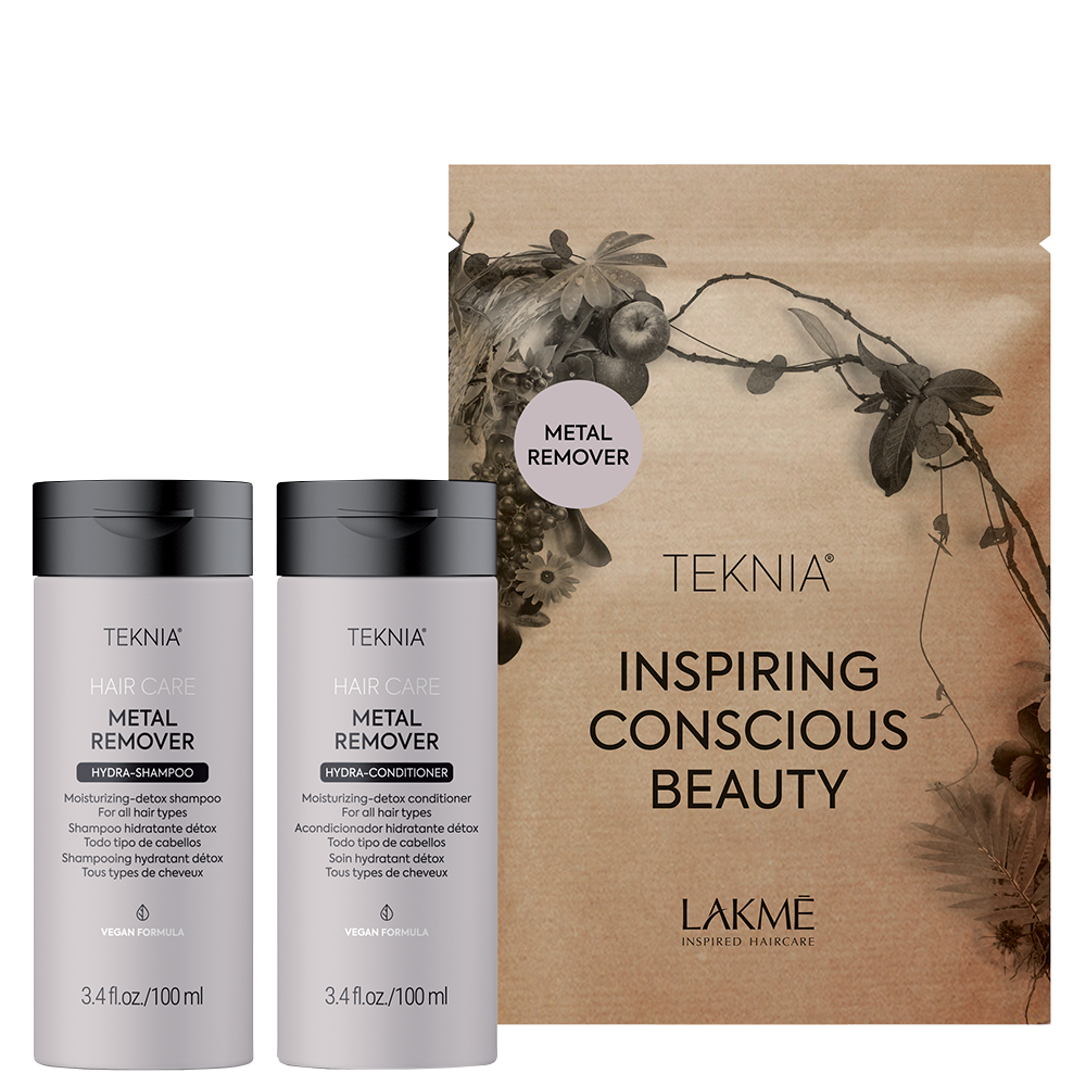 Комплект LAKME TEKNIA Metal Remover неутрализира и елиминира натрупванията на метали, минерали и замърсители от косата, съдържащи се в твърдата вода.