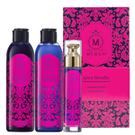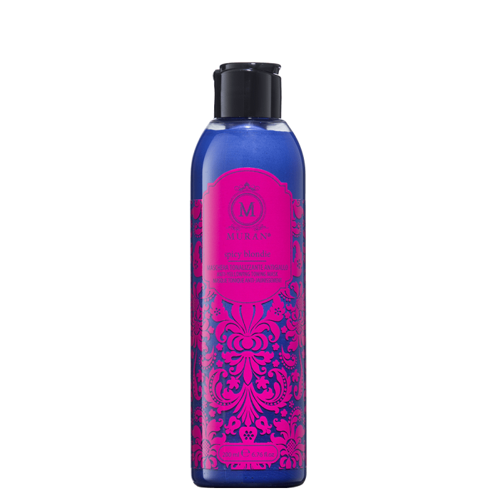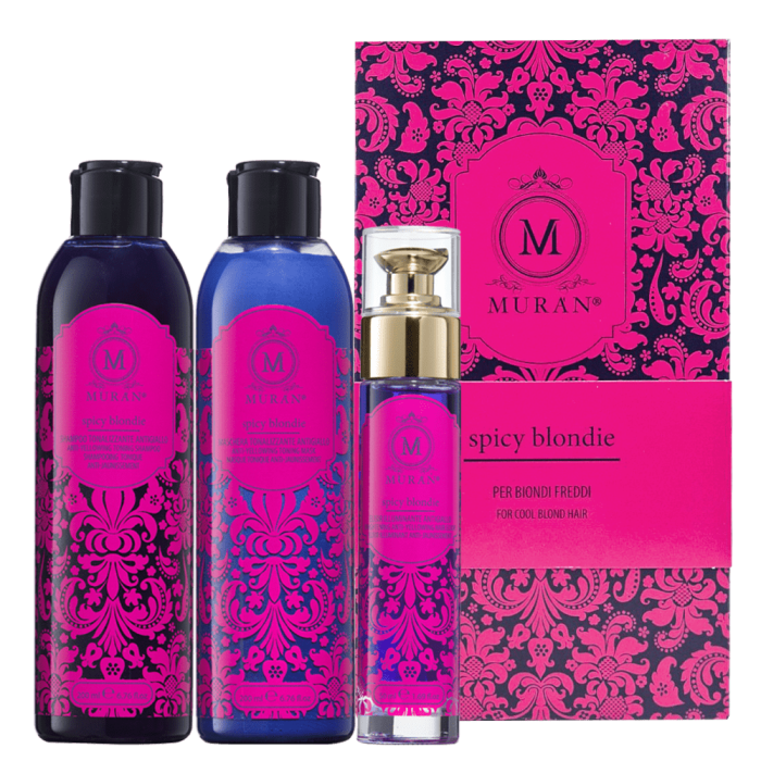 Комплект Muran Spicy Blondie предлага перфектната комбинация за премахване на нежеланите жълти и оранжеви оттенъци. Идеално освежава студените тонове на изрусената коса и придава цялостен блясък. Има завладяващ нежен аромат, който пленява сетивата.