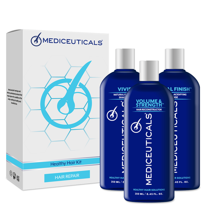 | Комплектът за възстановяване и подхранване на косата Mediceuticals Healthy Hair Kit Hair Repair съдържа: Детоксикиращ шампоан за дълбоко почистване Mediceuticals Vivid Natural Purifying Shampoo 250 мл Реконструктор за фина и увредена коса Mediceuticals Volume & Strength Hair Reconstructor 250 мл Подхранващ балсам за нормална, фина и увредена коса Mediceuticals Final Finish Natural Acidifying Rinse 250 мл Цена на продуктите, закупени поотделно: 137.80 лв. | 70.45 € |
