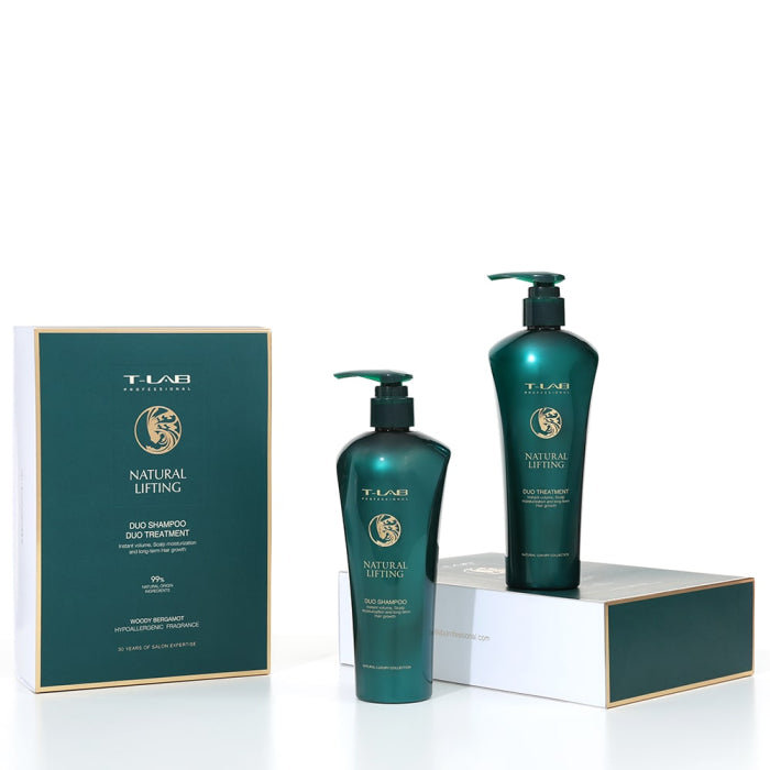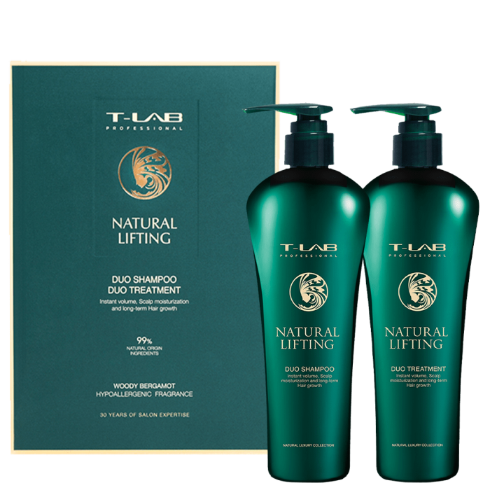 Шампоан за незабавен обем T-LAB Natural Lifting Duo Shampoo нежно почиства скалпа от всички замърсявания и остатъчни стилизиращи продукти, повдигайки косата от корена. Подходящ е за всеки тип коса, особено тънка и изтъняваща коса, която се нуждае от повече обем и плътност. Формулата със сертифицирани органични съставки осигурява обем хидратира скалпа в дълбочина. Подпомага естествения растеж, като съживява космените фоликули. Шампоанът уплътнява всеки косъм, позволявайки на косата да расте по-здрава, силна и подхранена. Резултатът е хидратиран скалп и коса с подобрена плътност и дълготраен обем. Съдържа 98,4% натурални съставки.
