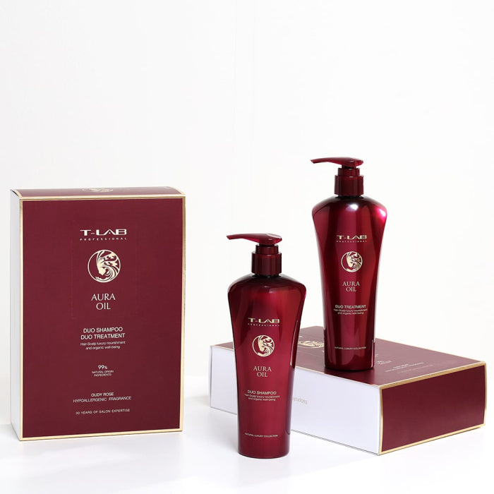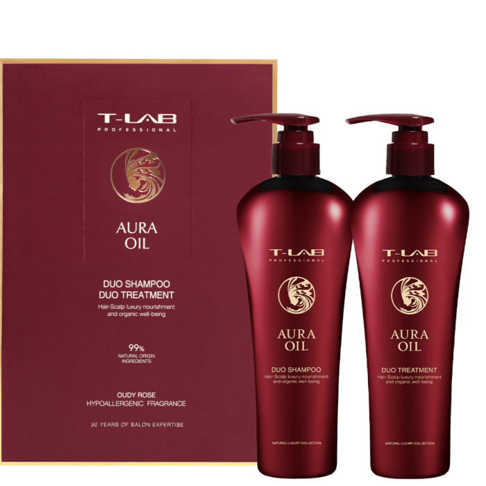 Шампоан T-LAB Aura Oil Duo Shampoo с органична камелия и яспис почиства нежно и е подходящ за всеки тип коса. Богатата на масла и витамини формула дълбоко подхранва, прави косата мека и лесна за разресване, възстановявайки естествения ѝ блясък. Терапевтичният комплекс от сертифицирани органични съставки намалява възпаленията в скалпа и нормализира процеса на производство на себум. Подобрява общото състояние на косата и скалпа, създавайки луксозно усещане. Мекият аромат с цветисти нотки събужда сетивата и успокоява ума. Съдържа 98,6% натурални съставки.