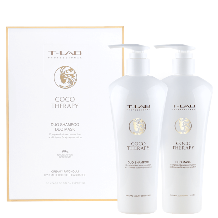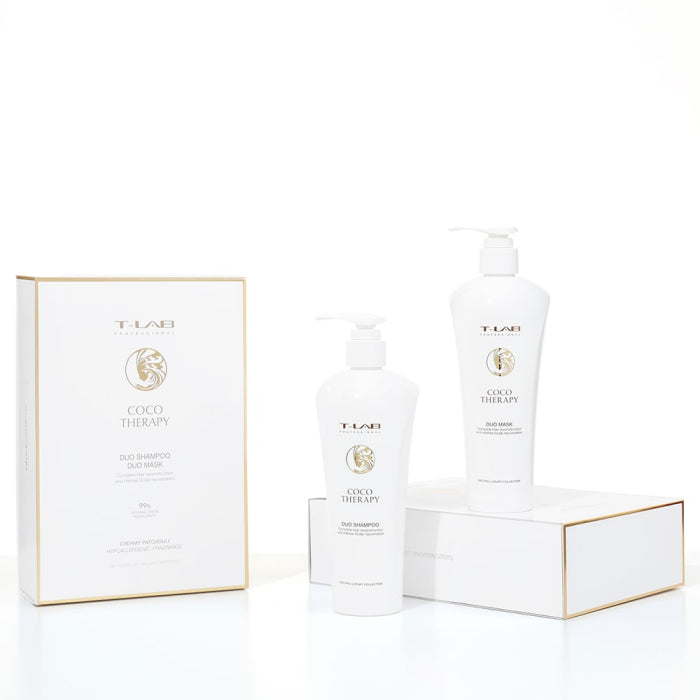 Възстановяващ шампоан с кокос T-LAB Coco Therapy Duo Shampoo нежно почиства и заздравява скалпа, като едновременно с това предотвратява накъсването и последващите увреждания на косата. Възстановява и предотвратява цъфтежа, като предпазва космените фоликули. Незабавно подобрява качеството на косата и здравето на кожата на скалпа. Съдържа 98,4% натурални съставки.