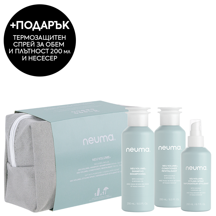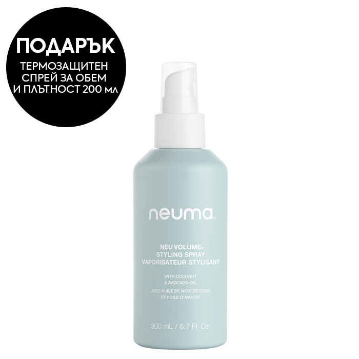 Подарък! Термозащитен спрей за обем и плътност 200 мл NEUMA Neu Volume Styling Spray - създава дълготраен обем и плътност от корена до върха на всеки косъм. Подобрява блясъка и жизнеността на косата и осигурява естествено, “подскачащо” движение. Хидратира, подсилва косъма, придава еластичност и го предпазва от накъсване. Защитава от вредното влияние на UV лъчите. Затваря кутикулата на косъма и предпазва от топлинна обработка. Поддържа наситен цвят на боядисана коса и придава сияен блясък. Осигурява жизненост и естествено движение на косата.Степен на фиксация: 2