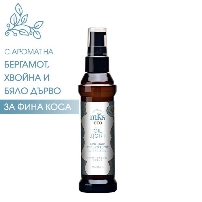 Еликсир Light Breeze дава на тънката коса ударна доза здравина, защита, копринена мекота, перфектна гладкост и впечатляващ блясък, без да я утежнява. Видимо намалява накъсването на дължините, запечатва цъфтящите краища и съкръщава наполовина времето за изсушаване. Елиминира статичното електричество и предпазва цвета на боядисаната коса от избледняване. Формулата му е на основата на мощна комбинация от две от най-ценните масла в света - арганово масло от Мароко и конопено масло, които осигуряват цялостно ревитализиране. Само няколко капки от ефективния еликсир са достатъчни, за да възвърнат естествените блясък и мекота на косата.