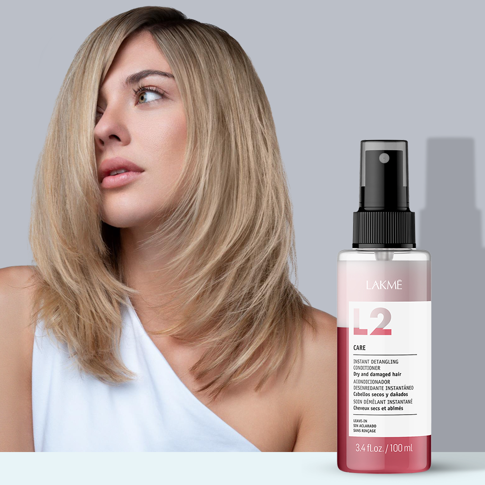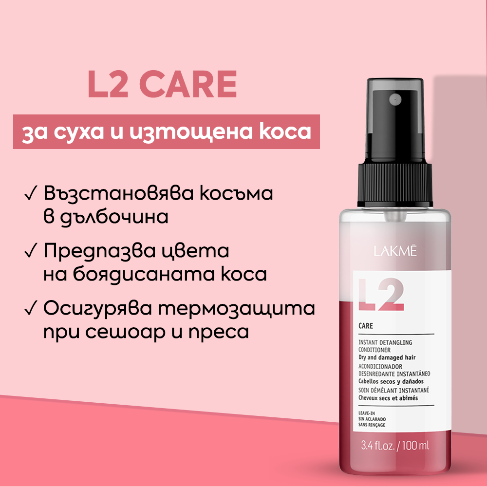Двуфазен балсам без изплакване за суха и изтощена коса LAKME L2 Care Instant Hair Conditioner възстановява силно увредената и суха коса, осигурява термозащита и предпазва цвета на боядисаната коса от избледняване. Подхранва в дълбочина, като възвръща мекотата, блясъка и еластичността, без да утежнява и матира. С лека формула, която таргетира най-чувствителните зони на косъма, осигурявайки мигновено разплитане и лесно разресване. Елиминира фриз ефекта, намалява накъсването и цъфтежа и защитава косъма от външни увреждания. Резултатът е гладка, блестяща, копринено мека и лесна за разресване коса с огледален блясък.