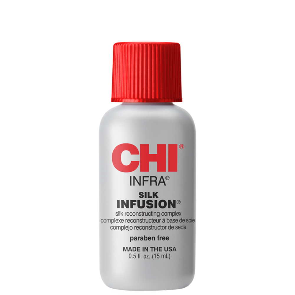 CHI Silk Infusion помага за възстановяването и укрепването на косата, като същевременно я предпазва от увреждане и накъсване, причинено от грубо разресване, редовна употреба на термо уреди и често боядисване. Неговата ефективна формула съдържа комбинация от копринени аминокиселини, кератин и пшенични протеини, които осигуряват невероятната мекота, еластичност и блясък, които косата придобива, само с няколко капки от серума. Независимо дали използвате преса, сешоар или маша, CHI Silk Infusion ефективно предпазва косата от увреждане по време на термообработка, както и от наелектризиране.