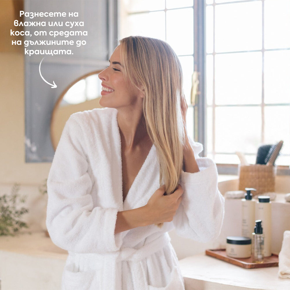 Начин на употреба: Нанесете 1-3 капки върху дланите и разтрийте, за да активирате съставките. Нанесете на влажна или суха коса от средата на дължините към краищата. Разрешете. Без изплакване.
