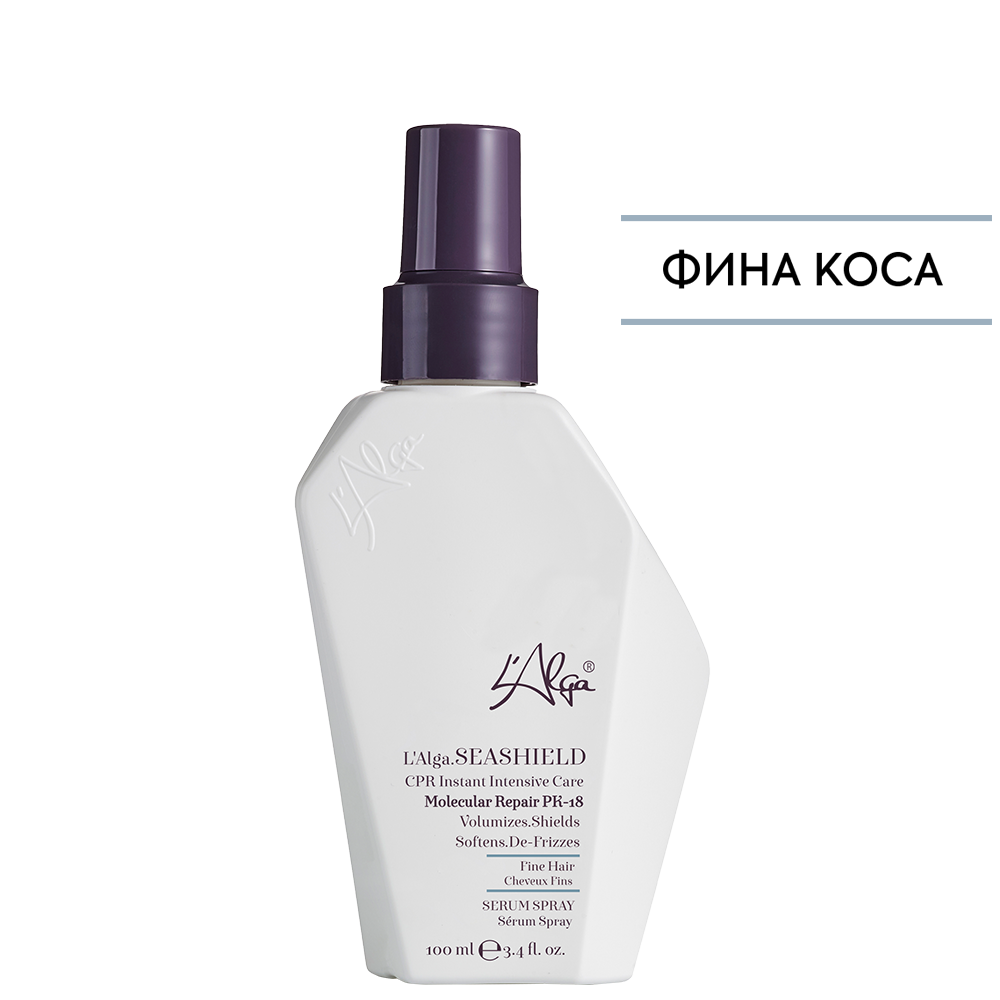 Спрей серум SEASHIELD осигурява висока и ефективна защита по време на термообработка, като предпазва косата от увреждане и изгаряне. Леката му формула осигурява обем от корена, без да утежнява фината коса. Насища косата с незаменими хранителни вещества, които попълват увредените участъци на косъма и ги възстановяват на молекулярно ниво. Придава копринена текстура на косата и изглажда стърчащите краища. Усъвършенстваната формула от последно поколение с пептид 18 и революционния комплекс AlgaNord 5 ™, в комбинация с хиалуронова киселина, сусамов протеин и 8 специални подхранващи агента, осигурява незабавно интензивно възстановяване на косата до най-дълбоките слоеве на косъма. Активира наново изграждането на вече счупените кератинови връзки, като по този начин драстично подобрява здравината, блясъка и мекотата на косата. Защитава цвета на боядисаната коса от избледняване.