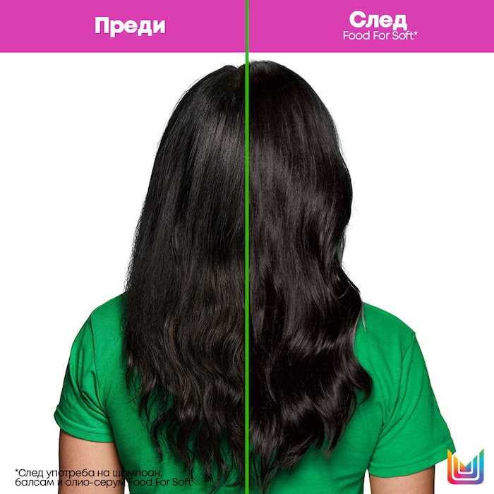 Начин на употреба: Нанесете на мокра коса, разпенете и изплакнете. Продължете с балсам и многофункционален олио-серум за коса Food For Soft.