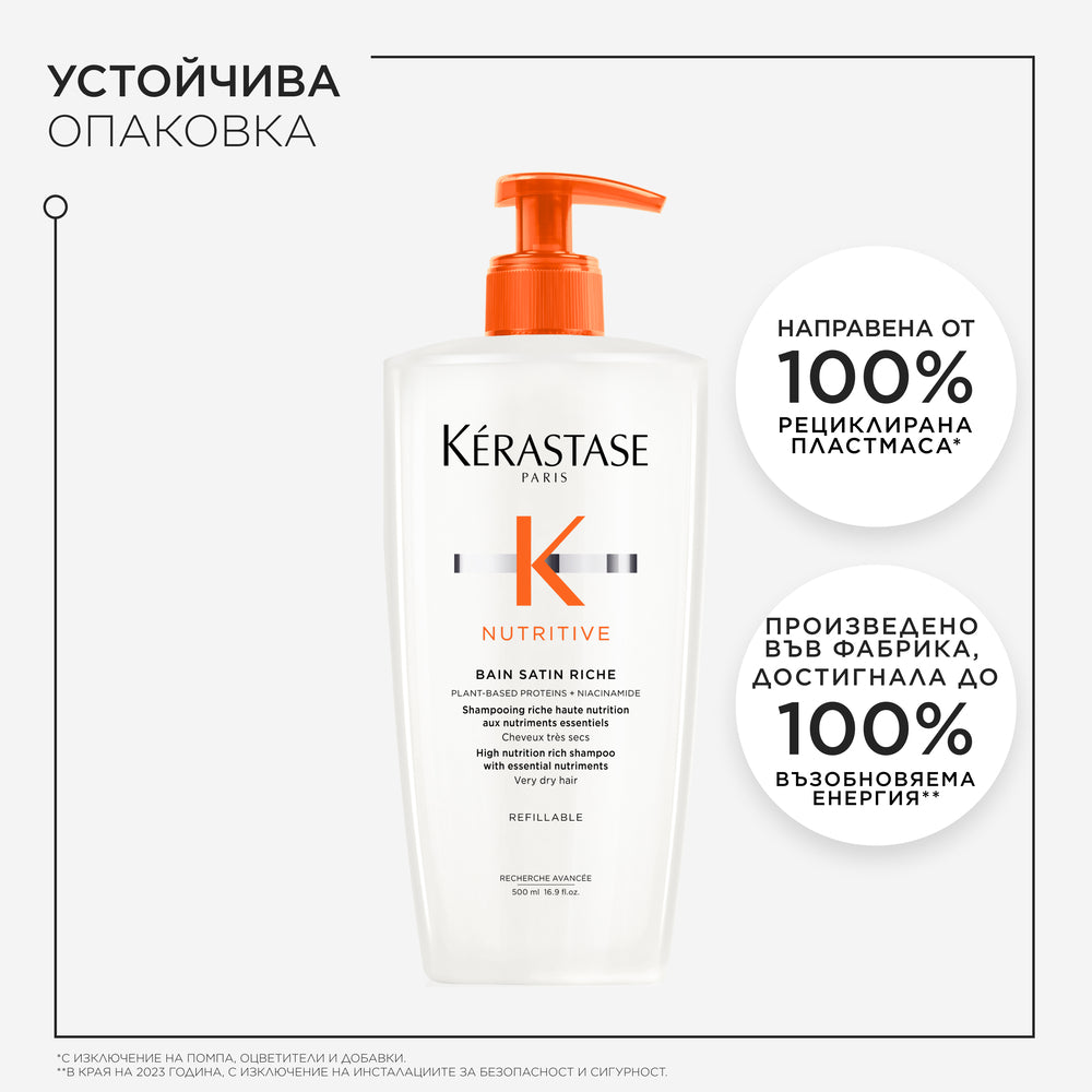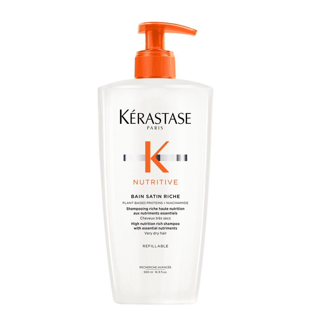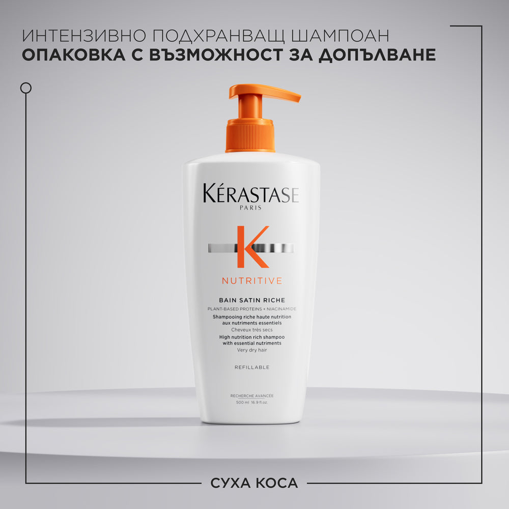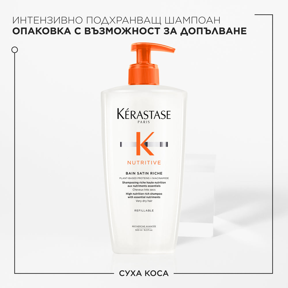 Интензивно подхранващ шампоан за много суха коса Kerastase Nutritive Bain Satin Riche с хидратиращо действие, обогатен с протеини с растителен произход и ниацинамид. Продукт с бяла кремообразна гел текстура, която създава богата пяна, което го прави подходящ за много суха коса и скалп. Съдържа формула, която почиства интензивно сухата коса, като същевременно възстановява хидратацията и комфорта на скалпа. Ревитализира и укрепва косата, за да се бори с изсушаването на косата. Възстановява плътността и блясъка на косата, като същевременно има омекотяващ ефект.