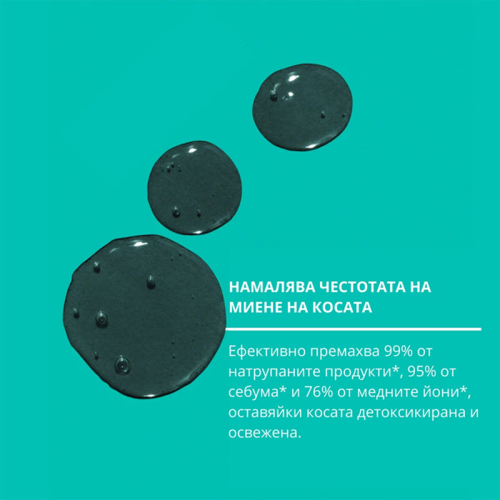 Дълбоко почиства косата и скалпа. Образува неагресивна, pH-оптимизирана пяна, която почиства космените фоликули и премахва натрупаните замърсявания, себум, метали от твърда и чешмяна вода, както и остатъци от тежки стилизиращи продукти, само след едно измиване.