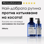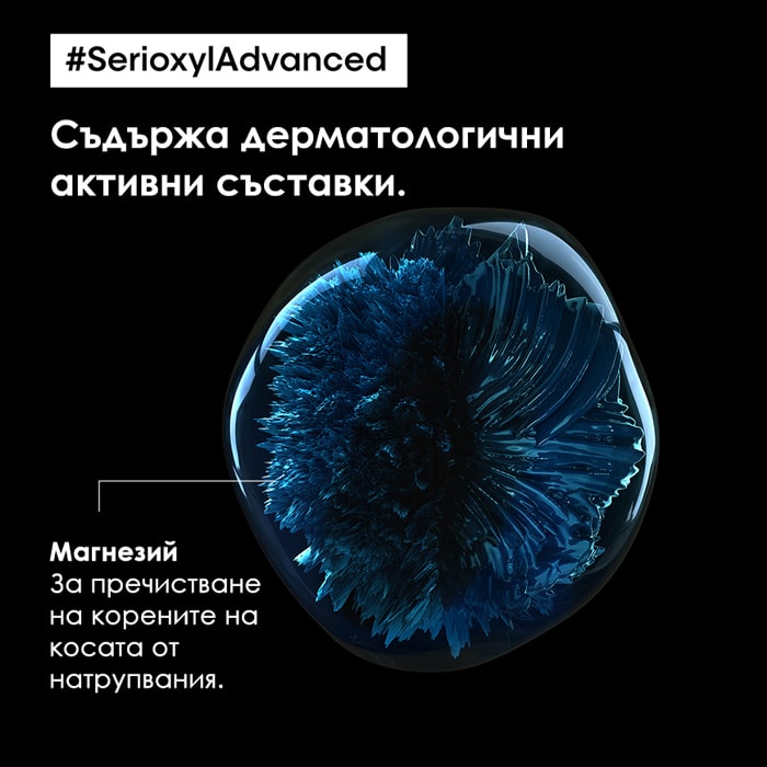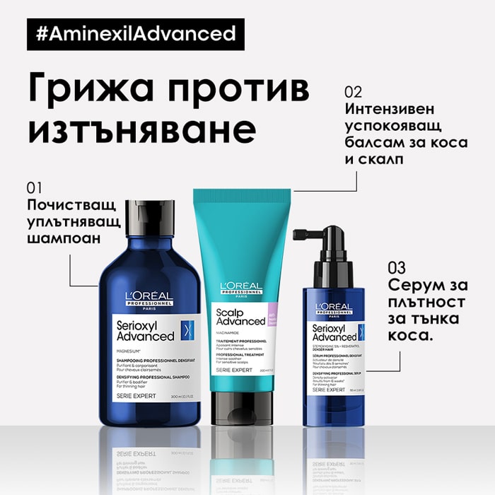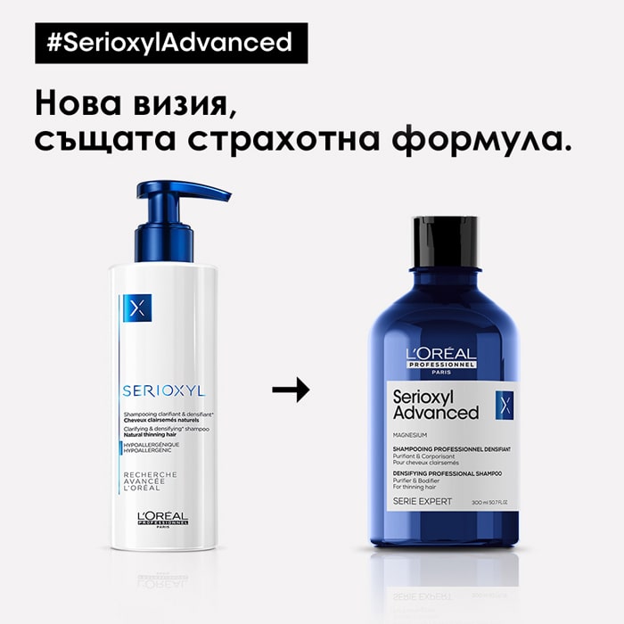 Шампоан против изтъняване на косата Serioxyl Advanced нежно почиства, уплътнява косата и я защитава от изтъняване. Формулата му е ултра концентрация на дерматологични съставки за сгъстяване на изтъняващата коса. Създаден съвместно от професионалисти и одобрен от дерматолози. Първа съвместна иновация с 3 професионални експерти по скалпа: експерт по балеаж и колористи. Притежава пристрастяващ свеж аромат.