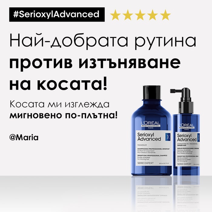 Вечер, след като измиете косата с шампоан Serioxyl Advanced използвайте и активиращ серум Serioxyl Advanced за по-плътна коса.
