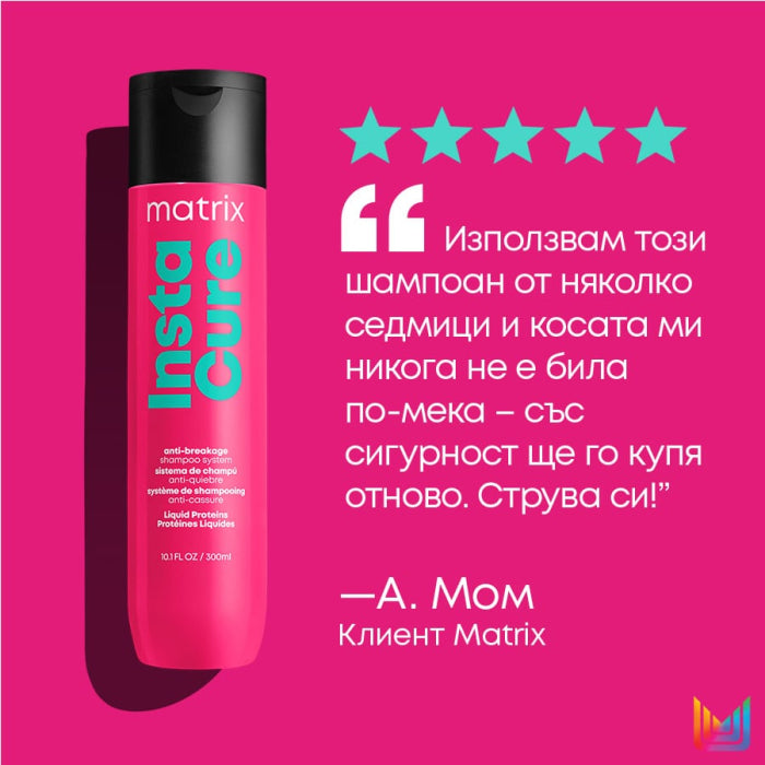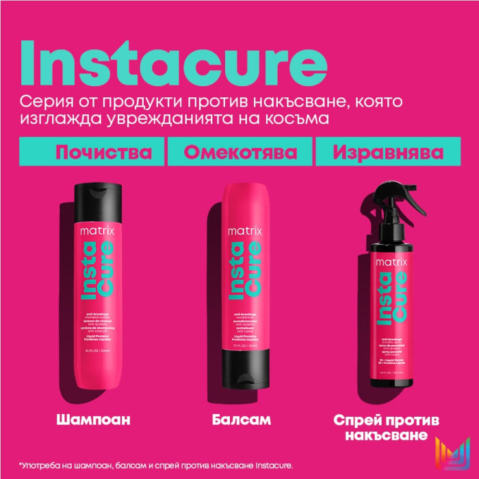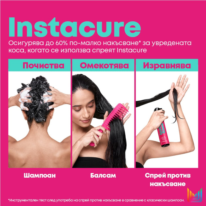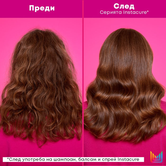 Начин на употреба: Нанесете нужното количество в корените на косата, разнесете по дължините и краищата и изплакнете. Комбинирайте с балсам и спрей против накъсване от серията Instacure.
