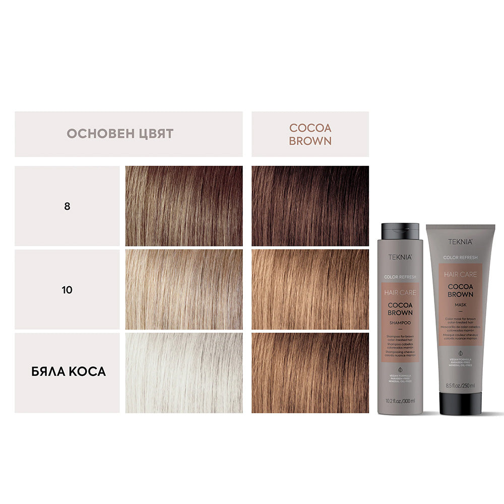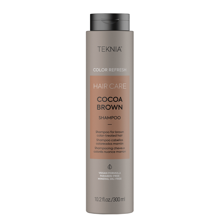 Оцветяващ шампоан за брюнетки LAKME TEKNIA Color Refresh Cocoa Brown Shampoo поддържа цвета на боядисаната коса в кафяви тонове. Тонира косата и компенсира избледняването на цвета, като го задържа наситен до следващото боядисване. Има антиоксидантни свойства и предпазва косата от вредното въздействие на UV лъчите и околната среда. Резултатът е мека, блестяща коса и жизнен цвят.