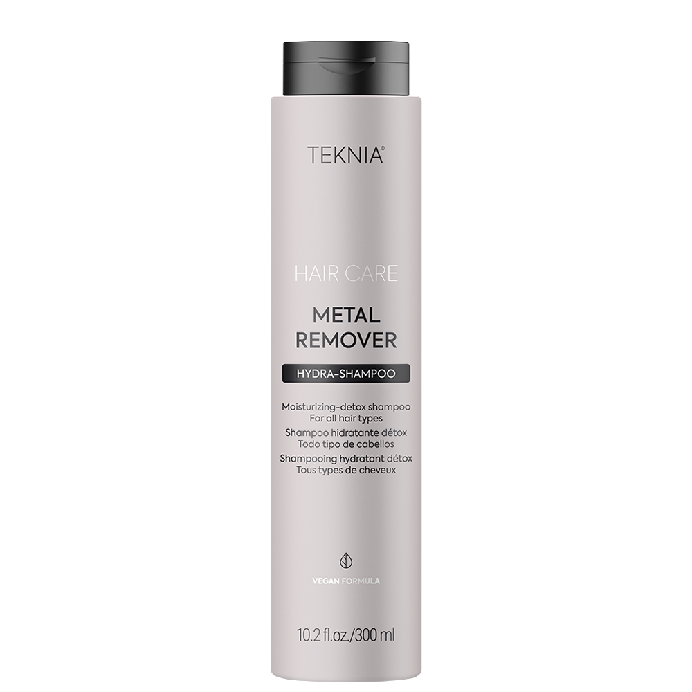 Шампоан за метален детокс и хидратация TEKNIA Metal Remover Hydra-Shampoo неутрализира и елиминира натрупванията на метали, минерали и замърсители от косата, съдържащи се в твърдата вода. Детоксикира и почиства в дълбочина. Хидратира и спомага за задържането на хидратацията в косъма. Възвръща естествения блясък, мекотата и здравия вид на косата. Подходящ за всеки тип коса.