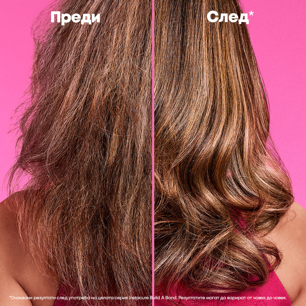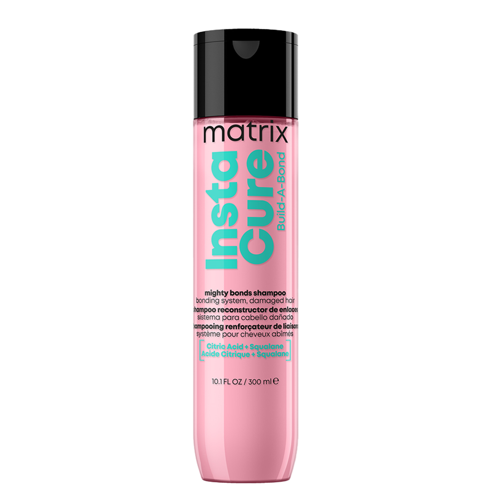 Шампоан за увредена коса Instacure Build-A-Bond Mighty Bonds Shampoo, обогатен с милиард връзки, лимонена киселина за укрепване от вътрешността и сквалан за омекотяване и изглаждане на повърхността на косъма.