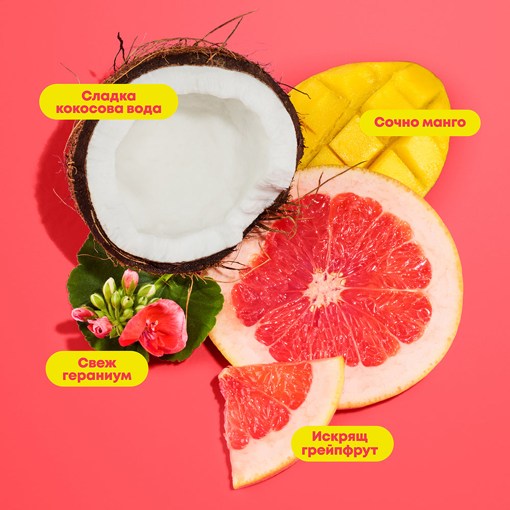Аромат: с ароматни нотки на грейпфрут със сочно манго за плодов привкус, свеж гераниум и сладък портокал за свежест, в комбинация с основни нотки на кокосова вода и мускус