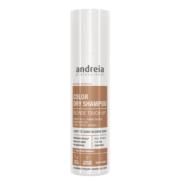 Веган шампоан за сухо измиване, за за светло до тъмно руса коса. Формулата с добавен цвят спомага за изравняването на цвета на косата. Съдържа фино оризово нишесте, което мигновено абсорбира мазните натрупвания и неприятните миризми, в резултат на което косата е чиста и свежа. Предназначен за кафява и светло кафява коса, шампоанът отлично прикрива плешивите петна, сивите коси и белите корени. Oсигурява допълнителен обем и текстура, без да оставя остатъци. Специално създаден да контролира омазняването, Color Dry Shampoo Blonde ефективно почиства косата, освежава скалпа и придава допълнителен обем.