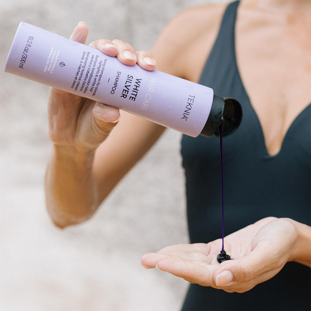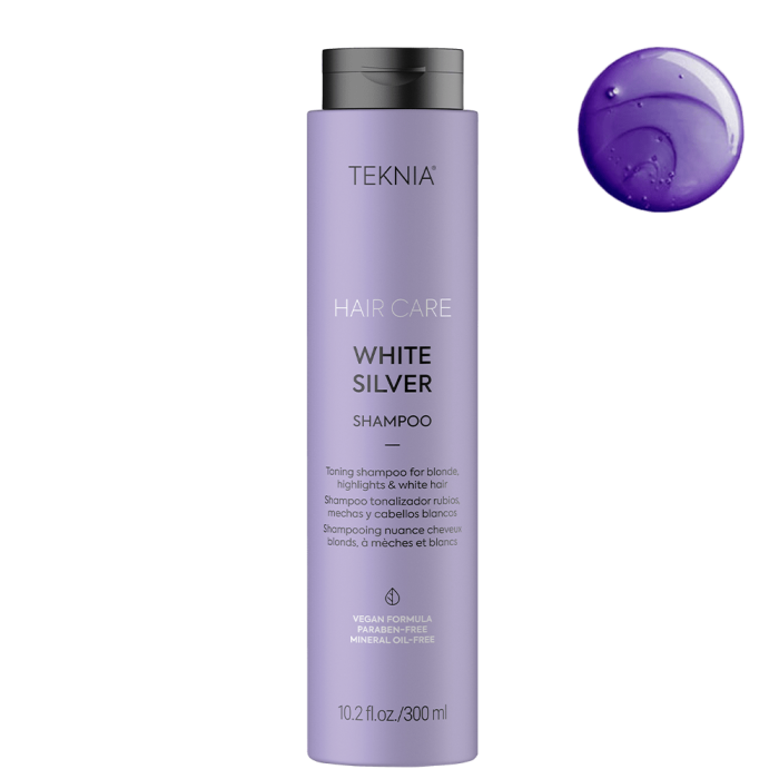 Тониращ шампоан за руса коса LAKME TEKNIA White Silver Shampoo нежно почиства косата и неутрализира нежеланите жълти оттенъци при белите и руси коси. Хидратира косата в дълбочина, съживява цвета и възвръща неговия блясък. Елиминира топлите тонове. Има успокояващо действие, омекотява косата и предпазва скалпа.