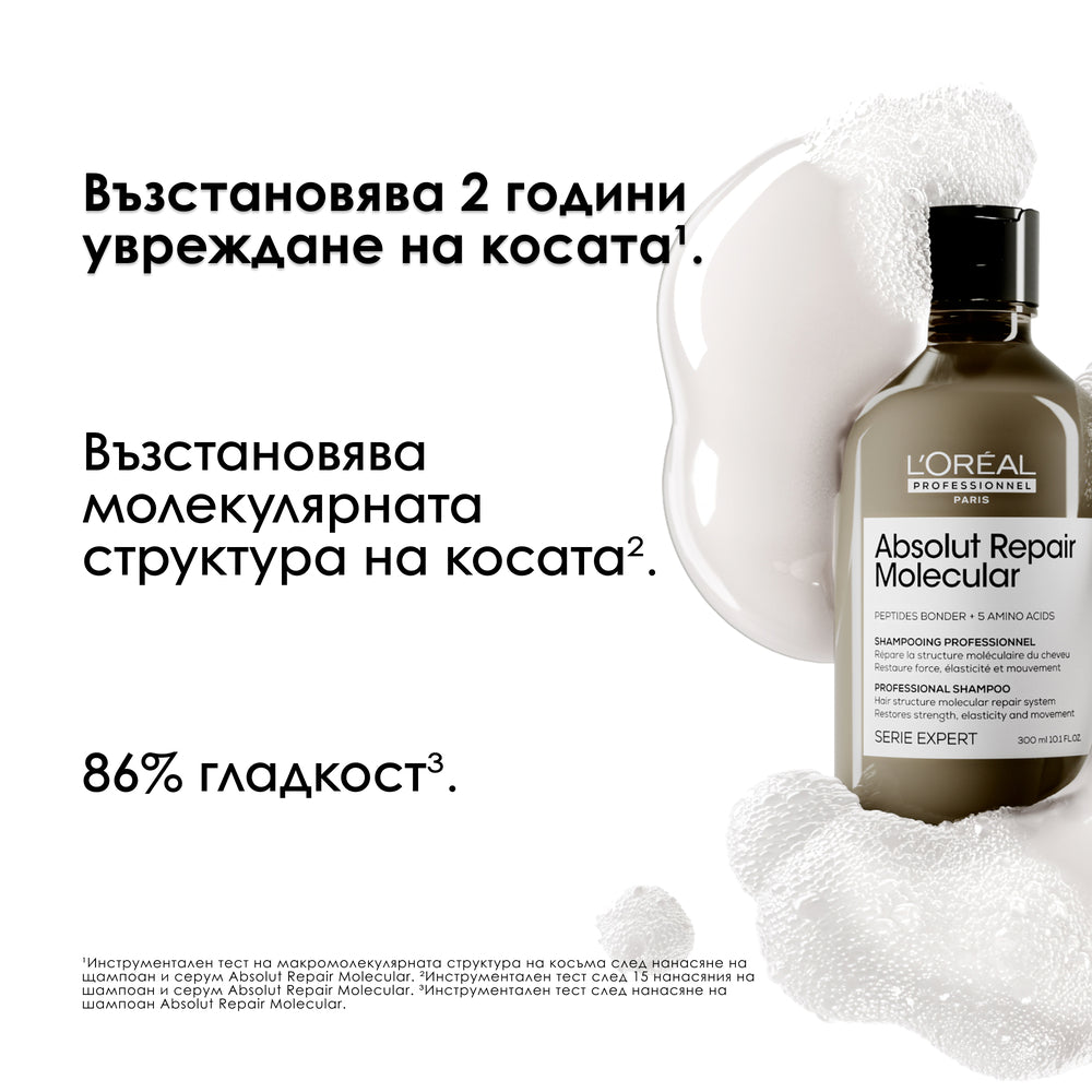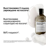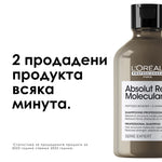 Шампоан за увредена коса Absolut Repair Molecular Shampoo, формулиран със система за защита на пептидните връзки и 5 аминокиселини с патентована формула. С богата кремообразна текстура, този продукт е обогатен със система за защита на пептидните връзки и 5 аминокиселини за възстановяване на молекулярната структура на повърхността на косъма*. Почиства, разплита косата и осигурява изключителна професионална грижа за увредената коса. Косата е по-силна и подхранена, с подобрена еластичност и се движи леко и свободно**.